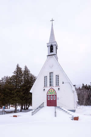 Saint-Denis-de-la-Bouteillerie, Quebec, Canada – February 6, 2022: Under the snow the chapel of the strand of Saint-Denis-de-la-Bouteillerie in the regional municipality of the Kamouraska