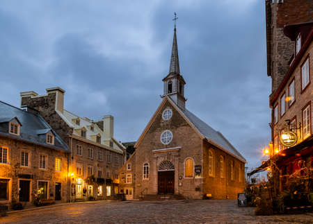Quebec, Canada - October 16, 2018: Early Morning View of Notre-Dame-des-Victoires Church in Place Royale of Old Quebec city, Canada.