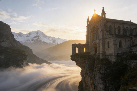 A majestic cathedral interior with a choir in harmony, illustrating the deep connection between music and religious devotion