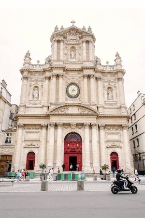 August, 11th, 2017 - Paris, France. Church of Saint Paul Saint Louis, located in Marais district, rue Saint-Antoine. French classicism cathedral with wooden red doors and carved gates in Paris.