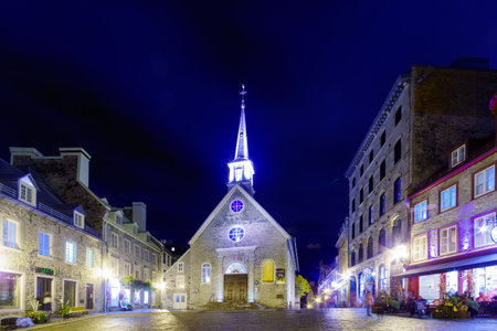 Quebec City, Canada - September 26, 2018: Night view of the Notre-Dame-des-Victoires Church with locals and visitors, in lower town of Quebec City, Quebec, Canada