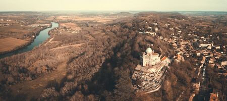 LOT-ET-GARONNE PENNE D'AGENNAIS, AERIAL VIEW OF OUR LADY OF PEYRAGUDE, ROMANO BYZANTIN STYLE BUILDING, FRANCE