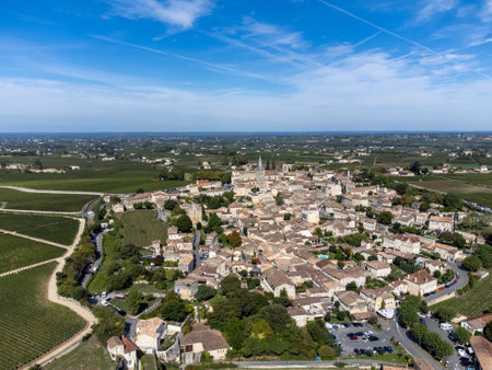 Aerial views of green vineyards, old houses and narrow hilly streets of medieval town St. Emilion, production of red Bordeaux wine on cru class vineyards in Saint-Emilion wine making region, France, Bordeaux