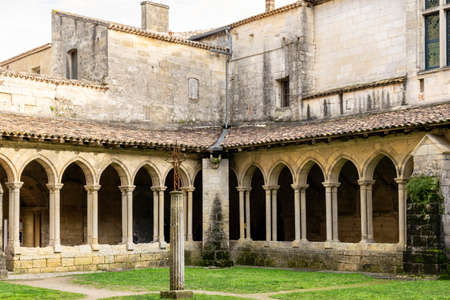 Stone arches framing a courtyard garden with cypress trees and a central fountain in the cloister of the Collegiate Church of Saint Pierre in La Romieu, France