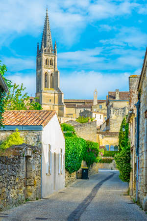 View of a narrow street leading to the monolithic church in Saint Emilion in France