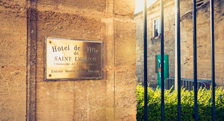 SAINT-EMILION, FRANCE - May 25, 2017 : plate of copper where it is engraved in French - town hall of Saint Emilion (building of 18th century) entered mairie Pioceau square