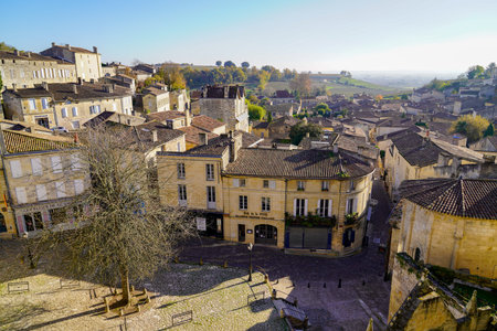 Saint Emilion, Aquitaine France - 11 21 2020: Saint Emilion Bordeaux city vineyard in aerial view from church