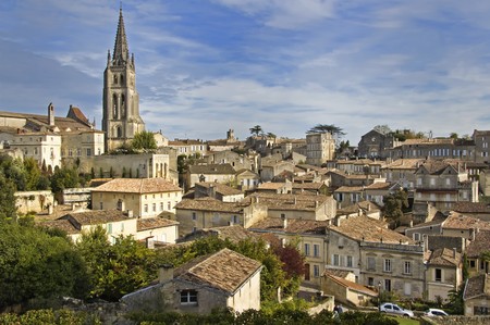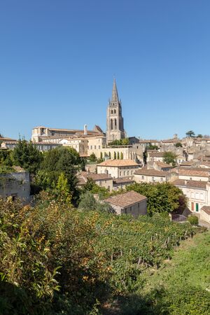 Aerial view of French village Saint Emilion dominated by spire of the monolithic church
