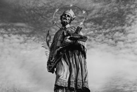 Statue of John of Nepomuk on Charles Bridge in Prague against the sky. Monochrome.