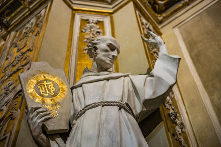 BOLOGNA, ITALY - DECEMBER 15, 2018: light is enlightening the statue of Saint Luke in the Sanctuary of the Blessed Virgin of Saint Luke