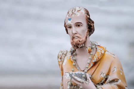 Old statue of catholic saint abandoned and broken with copy space