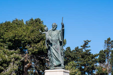 CAGLIARI, SARDINIA, ITALY - August 12 2020: Bronze statue of St. Francis of Assisi with night sky background