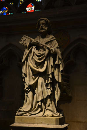Religious statue in Strasbourg cathedral. A colored window is in seen in the blurred background.