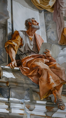 Depiction of a thoughtful man with a beard wearing orange and cream robes, raising his hand and pointing upward, symbolizing inspiration and contemplation in a timeless setting