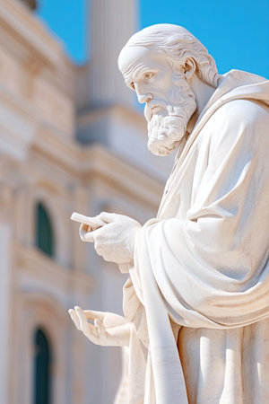 Ancient stone statue of man with smartphone, illustrating technological advancement in history