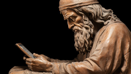 Bronze statue of bearded man reading book