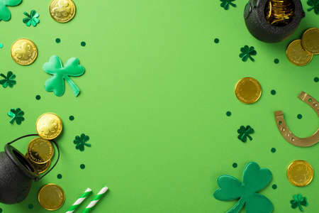 Top view photo of st patrick's day decorations pots with gold coins green shamrocks horseshoe straws and trefoil shaped confetti on isolated pastel green background with copyspace