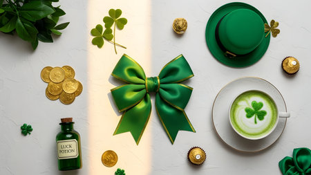 St. Patrick's Day flat lay. Green bow, cup of green tea, golden coins and clover leaves on a white background.