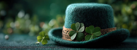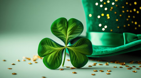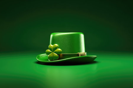 Green hat and shamrock on a vibrant green background for St. Patrick's Day celebration. This festive image symbolizes Irish culture and tradition, ideal for holiday cards, posters, and digital designs.