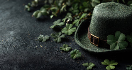 Green felt hat with a brown band is placed among clover leaves on a dark textured surface, perfect for St. Patrick's Day festivities and decorations
