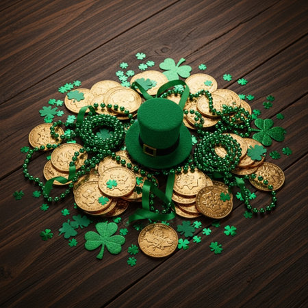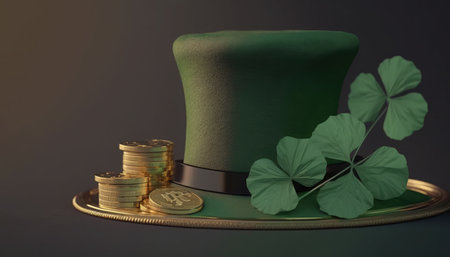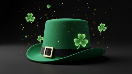 Green leprechaun hat with shamrocks, gold glitter, dark background, celebration.