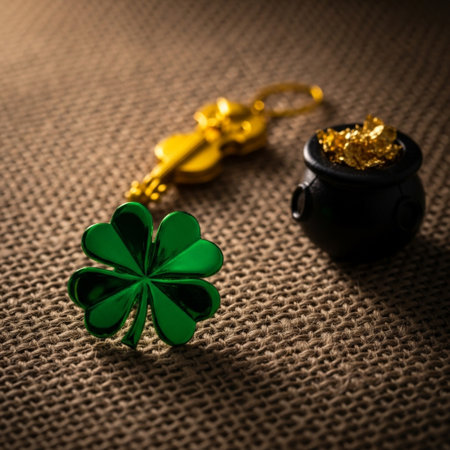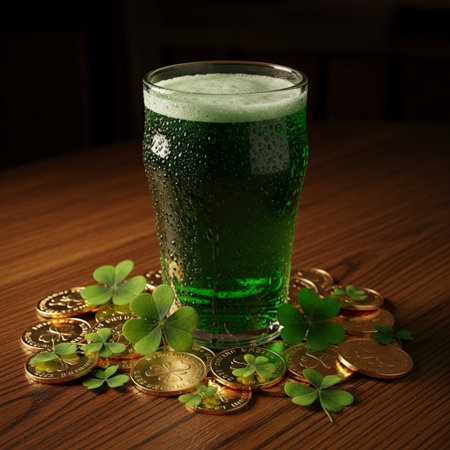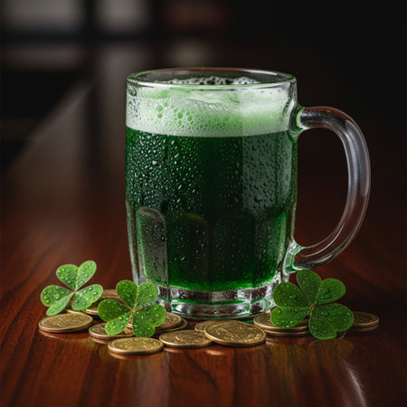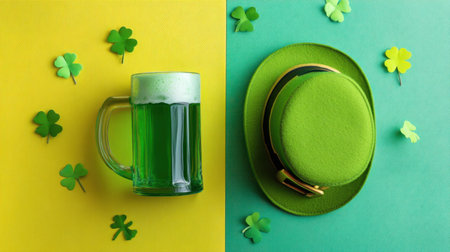 This vibrant arrangement features a mug of green beer and a green hat surrounded by shamrocks on contrasting backgrounds. Perfect for festive celebrations.
