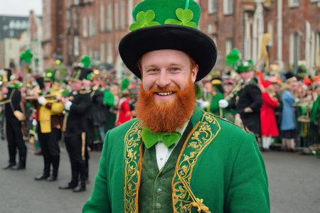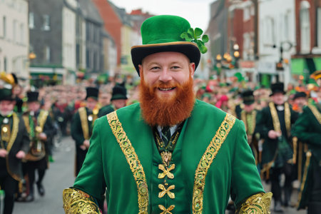 Joyful bearded man dressed as leprechaun celebrating at a festive parade. Feast of St. Patrick