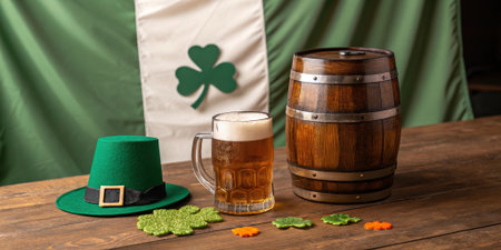 Beer mug with foam on rustic wooden table surrounded by green leprechaun hat shamrocks and barrel festive Saint Patrick Day decor. Cozy Irish holiday mood in green and brown colors.