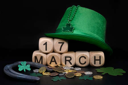 Concept of St. Patrick. Green hat, green necklaces and clovers, horseshoes, lucky coins and dice with letters March 17, St. Patrick's Day on black background