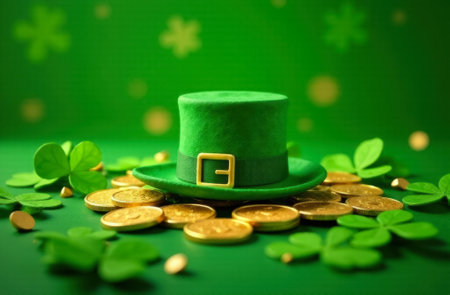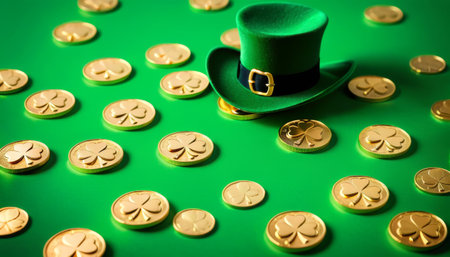 A vibrant green leprechaun hat sits surrounded by scattered gold coins with shamrock imprints, evoking the festive spirit of St. Patricks Day.. AI Generation