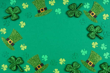 St Patricks Day shamrock and leprechaun hat frame. Above view over a green paper background with copy space.