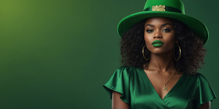 AI Generated. banner celebration St Patricks day Girl, beauty African American young woman in green dress and green hat free space