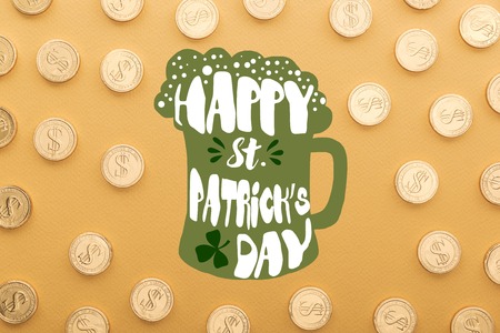 top view of shiny golden coins near happy st patricks day lettering on orange background