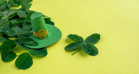 A symbol of St. Patrick's Day hat, elf, clover. Happy Shamrock clover. Green clover leaves isolated on a yellow background.