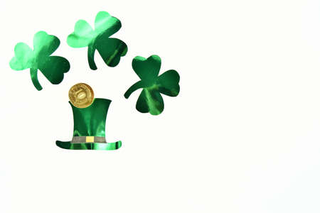 St. Patricks day, on a light background, green clover petals, a hat and Russian gold coins. close up and soft focus.
