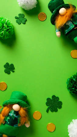 St Patricks day vertical background with leprechauns, shamrock clover leaves, gold coins, decorations. Flat lay, top view, copy space.