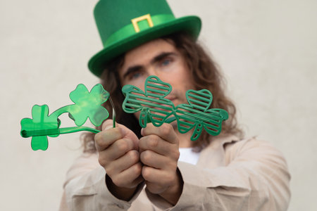 Young man choice funny Shamrock clover glasses wearing Green St. Patricks Hat against beige wall. Close up.