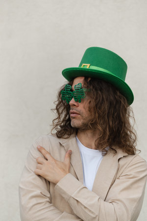 Man Wearing Shamrock clover glasses and Green St. Patricks Hat against beige wall. Space for design.
