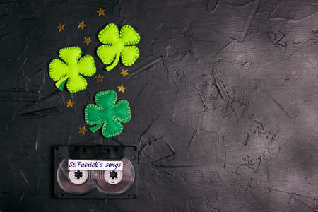 Audio cassette tape with Saint Patrick's Day songs and clover leaves on black background. Top down flat lay composition with copy space.