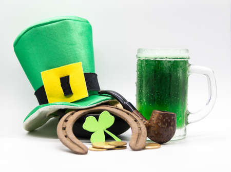 St. Patrick day symbols green alcohol drink shot, leprechaun hat and gold prills