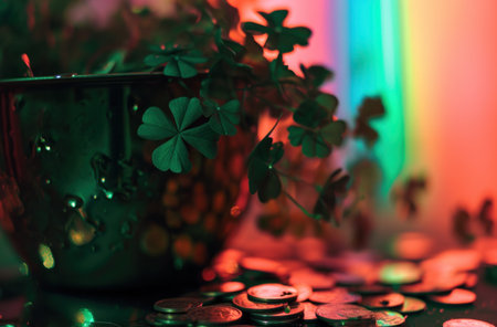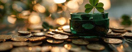 St. Patrick's Day clover leaves with gold coins and green ribbon on dark wooden background