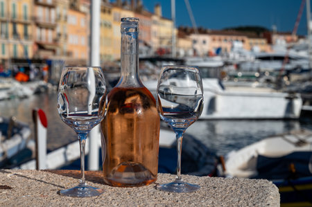 Glasses of cold french rose Cote de Provence wine in old fisherman boats port and yachts harbor in Saint-Tropez, summer vacation on French Riviera in Provence, France