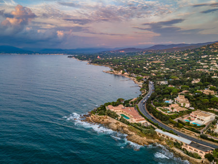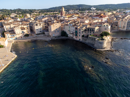 Aerial view on bays, beaches, old colorful houses of famous Saint-Tropez town on French Riviera at sunset, Var, Provence, France, summer vacation destination