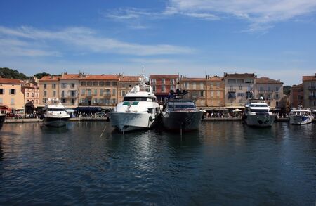 Marine view of Saint Tropez quay with luxury yachts and colorful houses