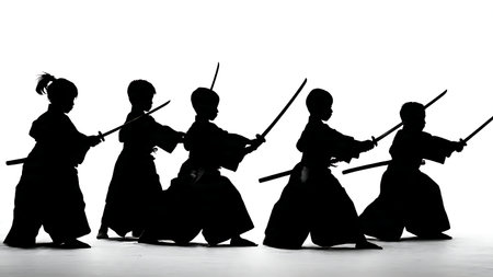 Samurai Children Training with Bokken Silhouette Set isolated on plain white background.