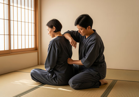 Shiatsu therapist applies elbow pressure to a seated woman lower back in traditional japanese setting. focus on holistic health, therapeutic massage, and wellness practices.