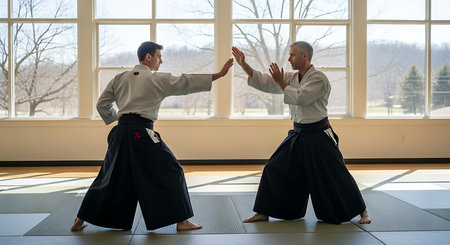 Aikido with trainer. Active sportive boy in white kimono practicing aikido with trainer