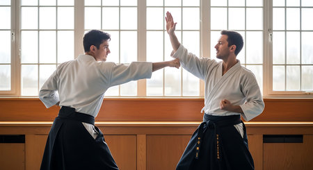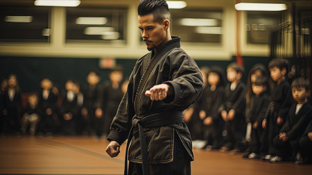 Karateka and sensei bowing in dojo warm colors respectful posture engaging karate scene