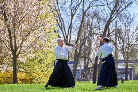 Riga, Latvia - May 8, 2022: Two aikido fighters training with stick in the public park. Blooming sakura at the background.