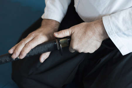 a warrior in a white kimono takes out a sword from its scabbard. close-up of the hands of a warrior with a sword